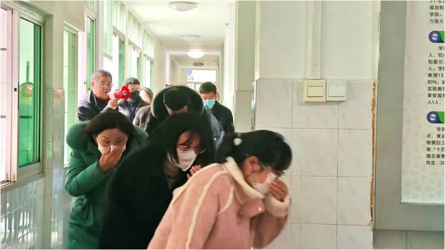 演练伊始,学院办公室拨通了报警电话,学校保卫处工作人员到达后点燃了烟雾弹,现场模拟火灾突发场景。陈根洪主任迅速反应,按照消防疏散预案有序组织教职工弯腰捂鼻,沿安全通道快速撤离至指定安全区域,整个逃生过程紧张有序、有条不紊。