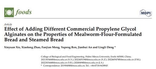 本网讯(通讯员 王智勇 王智勇/文 邓伶俐/图)近日,生物与食品工程学院汪兴平教授食品科学团队邓伶俐博士以365电子娱乐官方网站作为第一单位在《Foods》上发表论文Effect of Adding Different Commercial Propylene Glycol Alginates on the Properties of Mealworm-Flour-Formulated Bread and Steamed Bread。该期刊可在ScopusSCIEWeb of Science)、PubMed等数据库中索引,其为JCR-Q1(Food Science & Technology)/CiteScore-Q1(Health Professions)期刊。5年影响因子为5.5。该研究得到了国家自然科学基金(批准号:32160610)的资助。