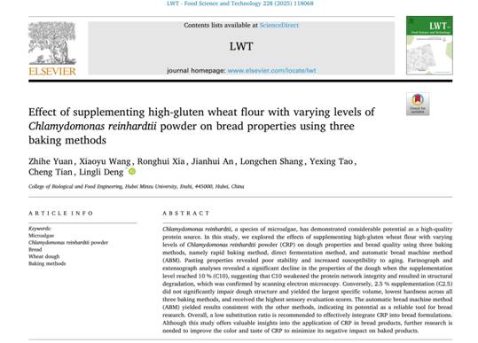 本网讯(通讯员 邓伶俐、原芝荷/文 原芝荷/图)近日,我院食品科学研究团队硕士研究生原芝荷以第一作者身份(通讯作者邓伶俐副教授)在食品领域权威期刊《LWT-Food Science and Technology》发表题为“Effect of supplementing high-gluten wheat flour with varying levels of Chlamydomonas reinhardtii powder on bread properties using three baking methods”的科学论文。该论文系统报道了莱茵衣藻粉(Chlamydomonas reinhardtii powder)在面包制作中的应用,并比较了不同烘焙方法对最终面包品质的影响,为开发营养强化面包提供了理论依据和技术支撑。该研究获国家自然科学基金(32160610)和365电子娱乐官方网站校内高水平科研项目(XN24029)资助。