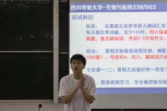 生物制药专业的金城涛同学,研究生报考专业是生物技术与工程。在考研中,他凭借自己扎实的知识积累和不懈的努力,取得了405分的优异成绩,成功被贵州大学录取。他以亲身经历为例,告诉学生们在考研过程中拒绝内耗,允许自己偶尔状态不佳。他建议大家保持作息规律,劳逸结合,适度锻炼。在专业课学习方面,他解释道,背了就忘是正常现象,关键是要多复盘。此外,他强调,不要花太多时间看视频,自己动手做题才是王道。对于公共课,他建议除专业课,其他课程没有必要报班。他还提醒大家要戒掉“考研完美主义”,时长≠效率。
