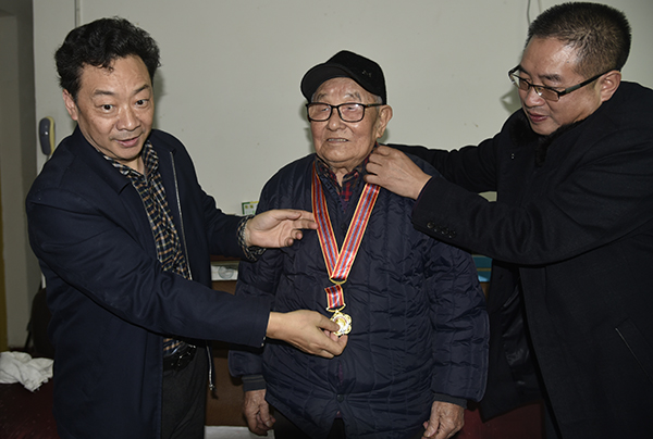 党委书记吴建清(左)为赵友森老人佩戴纪念章