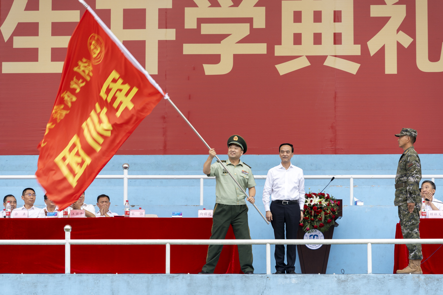顿祖义主持2023级本科生军训动员大会。向前进为军训团授旗。军训团政委、学校党委副书记邓磊宣读军训团成立文件。