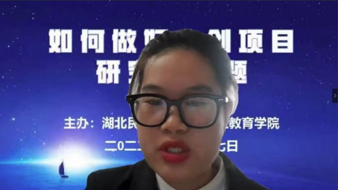 教师教育学院学科建设与研究生管理办公室主任邹太龙、智能科学与工程学院教师邱达、体育学院创新实践中心主任肖哲、文学与传媒学院2019级新闻系学生魏源源四位嘉宾,分别作了《大创项目的申报、实施与结题》《大学生创新创业项目选题及实施探讨》《大创项目申报、管理与结题的做法》《大创项目研究经验分享》的报告。创新创业教育学院李永诚副教授主持学术沙龙
