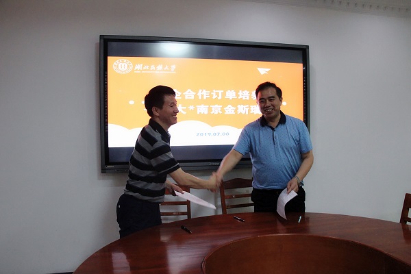 本网迅(通讯员 刘佳/文 彭璟/图)7月8日下午,生物科学与技术学院与南京金斯瑞生物科技有限公司在至真楼二楼会议室举行校企协同育人订单培养班开班仪式。南京金斯瑞生物科技有限公司副总经理徐士军,人事部经理卢占伟,我校教务处副处长谭华,该院党总支书记邓顺松,院长张驰,生物制药系系主任刘晓鹏出席仪式,学生科、教学科相关负责人和第一期订单培养班的20名学生参加了此次开班仪式。张驰与徐士军签订校企合作订单培...
