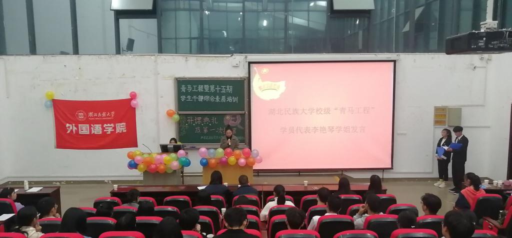 活动伊始,在全体成员起立奏唱团歌后,首先由陈小双老师宣读《外国语学院青马工程培训班培养方案》,粟登平老师致辞后青马工程学员代表李艳琴及干训培训班学员代表胡迪发言。