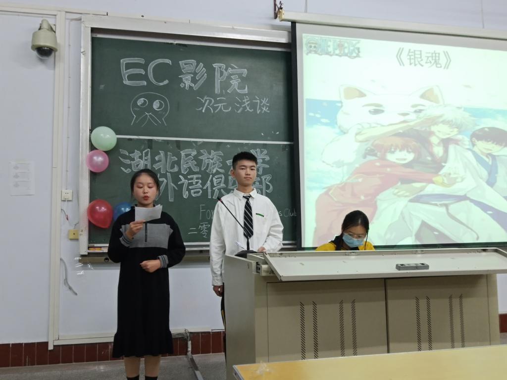 时间:2020-11-16 编辑:学生科 点击:本网讯(记者杜婷婷 覃松燕)为丰富大学生课余生活,展现外语独特魅力,外语俱乐部于11月13日晚19:00在外国语学院6402教室举办以“次元浅谈”为主题的EC影院活动。此次活动面向我校全体师生。