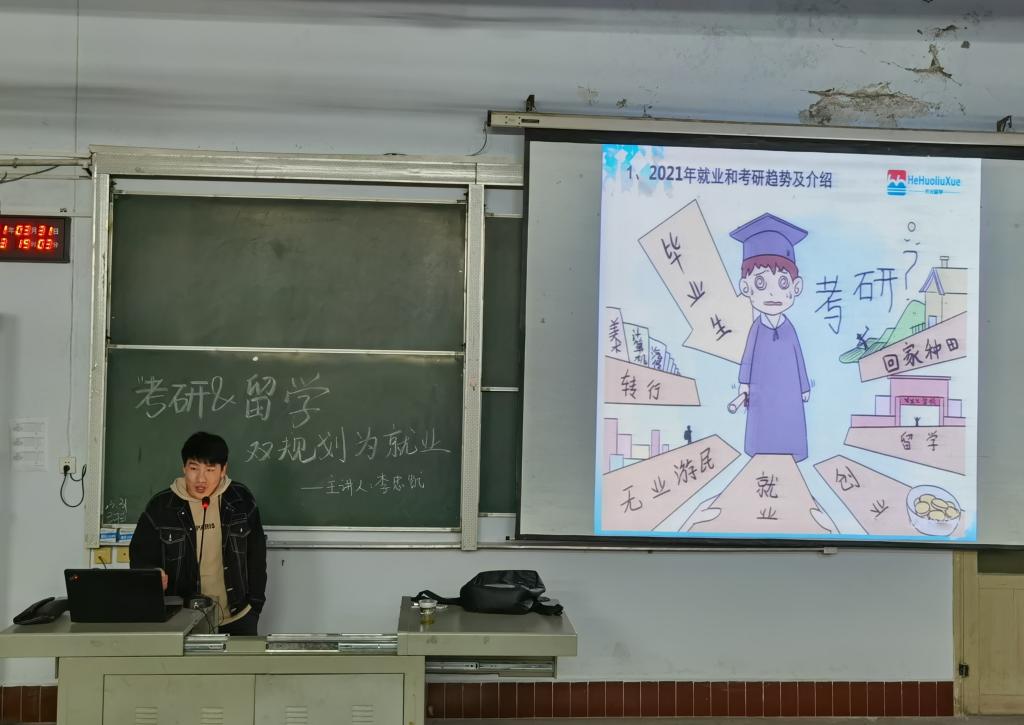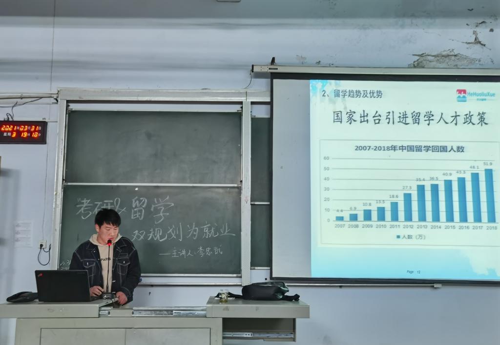 时间:2021-04-01 编辑:学生科 点击:本网讯(通讯员 李梦然/摄影 蓝雨璇 赵雪)3月31日晚,我院学生会学风建设部于文汇楼6401教室成功举办“考研&留学” 双规划知识讲座,我校校友李忠凯担任此次讲座主讲人,俄语老师刘波莅临现场进行指导。