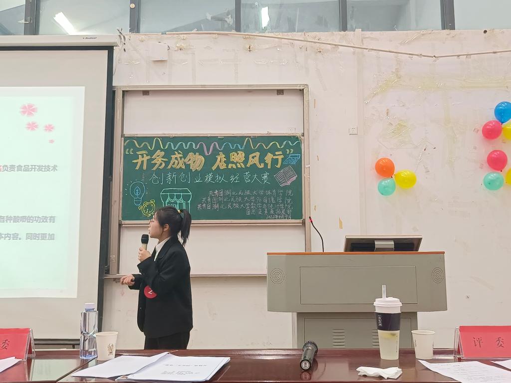 经过初赛的激烈角逐,共有10名选手进入决赛。选手们在讲台上激情四射,充满活力,以PPT的形式展示项目成果。其中3号选手向湘粤《黄金二手书策划书》的项目,从项目背景与团队介绍、店面概述、优势分析、市场分析、营销计划五方面进行展示。同时,其从前期市场调查分析总结出大学生消费者群体在二手书购买及出售中存在巨大需求量,强调二手书具有广阔市场,说明其创新想法具有较强可行性。另外,4号选手黄袁望《青春民大,健身无限》的项目,该团队借助自身体育专业学生的优势,将专业健身知运用到创业实践中。针对校内师生开设健身房,方便本校师生在校健身,从而拥有更健康的体魄,其想法得到现场评委认可。