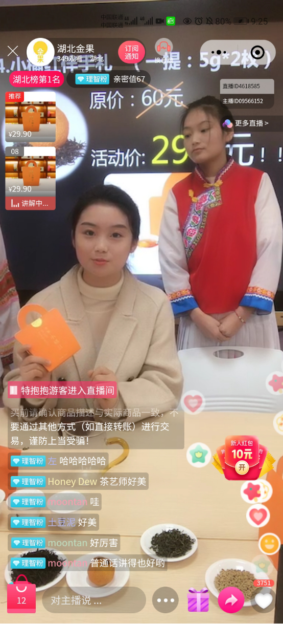首先上架的是硒茶类产品:分别为具有疏风清热、清喉利咽功效的薄荷杯茶和具有美容养颜、抵抗衰老、顺气清脑作用的茉莉花杯茶。这两款杯茶极具特色,它是将特定分量的茶叶与一次性环保纸杯融合一体,茶叶则被用一层植物纤维纱膜隐藏在杯底区域,设计精巧,方便快捷。其次是汤色透亮、香气馥郁的芳讯香茶,主播为大家展示了金果香茶基地的产业规模和茶叶生长环境。其次推出了热销的小橘红伴手礼,该产品是将金果红茶的独特茶营养与巴东柑橘皮的药用价值糅为一体,历经10次烘焙、20道工艺、1000次的调配实验打造出的一款茶香与橘香融合的金果小橘红。在直播间,湖北金果茶业有限公司的茶艺师向江萍为网友展示茶艺、解答网友的相关疑惑。
