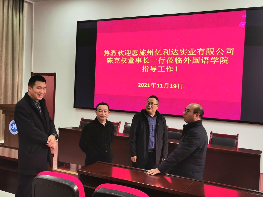 时间:2021-11-23 编辑:谭 点击:11月19日下午,恩施州亿利达实业有限公司出资捐建的外国语学院学术报告厅揭牌仪式暨校友座谈会举行。亿利达实业有限公司董事长、我校84级校友陈克权与外国语学院院长骆贤凤共同为学术报告厅揭牌。