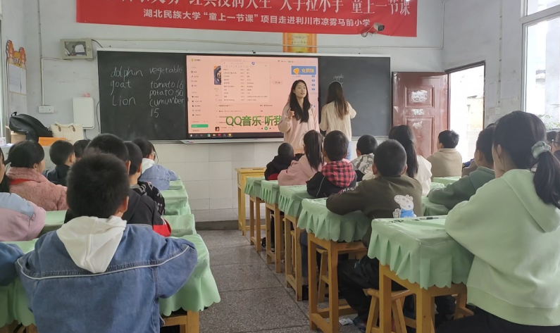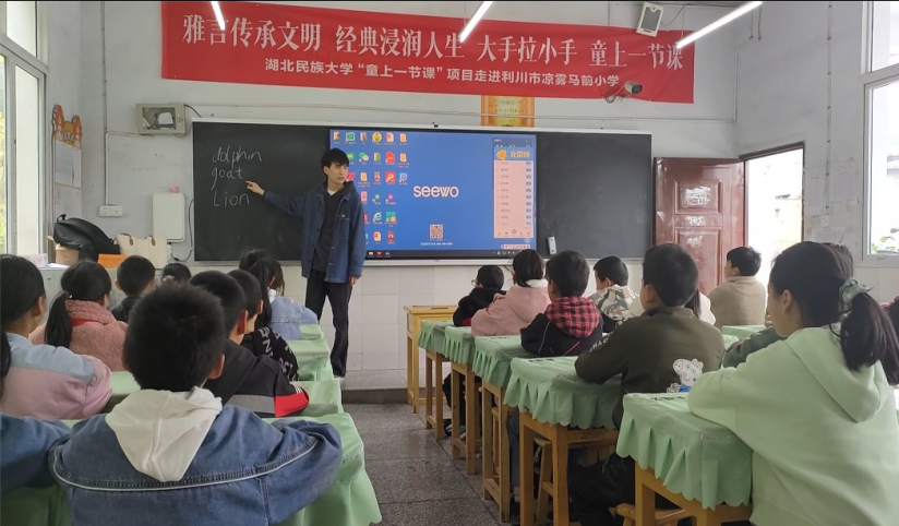 2023年4月27日,外国语学院研究生党支部前往利川市凉雾乡马前村开展特色主题党日活动。党员们走进马前村小学五年级二班的教室,与同学们开展互动交流,上了一堂生动有趣的英语特色课。