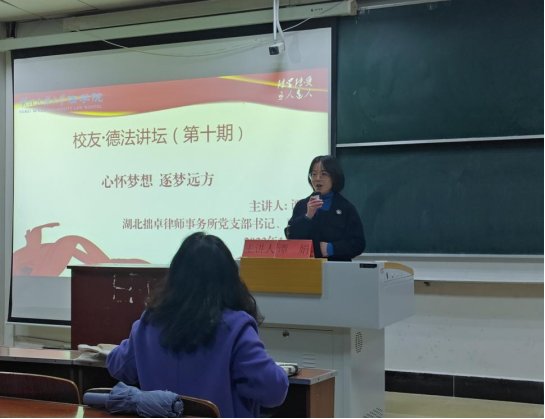 本网讯(见习记者 蔡雪婷/文 田伊俐/图11月19日,第十期校友·德法讲坛9b301教室顺利开展,我院2006级优秀校友湖北拙卓律师事务所党支部书记、副主任谭娟担任主讲人我院副教授、硕士研究生导师杨信担任主持人。学院学生科科长阙嘉苗、团总支书记谢学婧全体23级学生共同参加本次讲座。