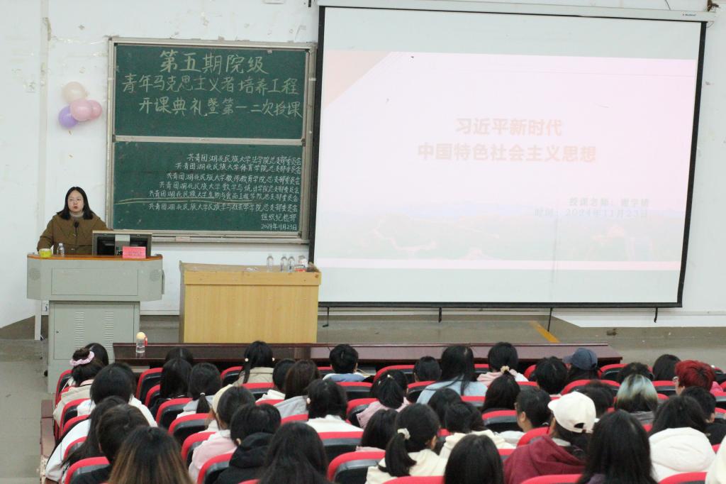 本网讯(记者 袁本怡 见习记者 刘微微/文 谭正法 侯方俊/图)11月23日,我院联合体育学院、生物与食品工程学院、民族学与社会学学院、数学与统计学院、教师教育学院等六个学院于修远楼5B508教室共同举办第五期院级“青年马克思主义者培养工程”开课典礼暨第一次授课。我院团总支书记谢学婧、体育学院团总支书记黄昱勍、生物与食品工程学院团总支书记程琴、民族学与社会学学院团总支书记吴尚、数学与统计学院团总支书记李子君、教师教育学院教师刘纮均出席本次活动。