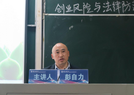 本网讯(记者 杜玉泽 见习记者 龙涛/文 刘皇 王雅琪/图)为培养学生创新创业能力,增强法律防范意识。11月21日,我院于德智楼9A410教室举办以“我敢闯,我要创,我会创”为主题的创业风险与法律防范知识讲座。湖北图盛律师事务所党支部书记、合伙人企业法律事务中心负责人彭自力律师受邀出席担任主讲人。我院副院长李文革担任主持人,部分师生到场学习。