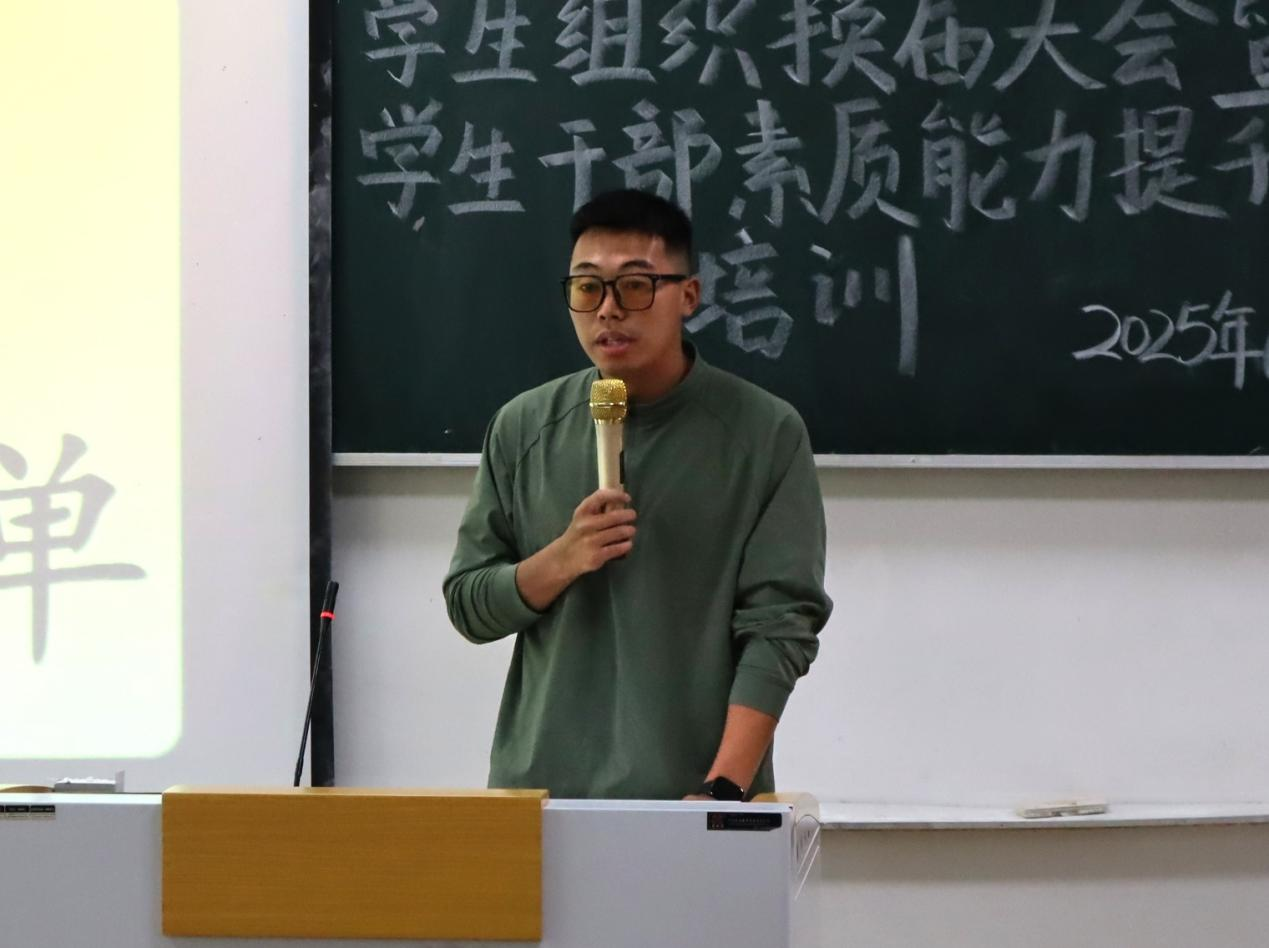 本网讯(记者 曾钰格/文 李佳萱/图)2025年6月15日,我院于德智楼9B301教室举办2025年学生组织换届大会暨学生干部素质能力提升培训。此次大会由我院团委书记谢学婧主持,我院党总支副书记黄晓波、学生党支部书记彭阳出席,100余名学生干部参加。