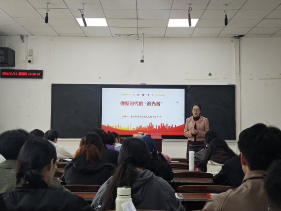 11月14日,音乐舞蹈学院党总支副书记邓丽老师结合自身经历为各发展对象带来一次生动党课。她提到作为新时代好青年,要以坚定的理想信念为帆,以不懈的奋斗为桨,在时代的浪潮中乘风破浪,为中华民族伟大复兴的中国梦贡献自己的青春力量。作为青年大学生,“追随光,成为光,发散光”应当成为大家人生信念的一部分,她鼓励各发展对象通过不懈的奋斗去实现个人价值,为实现中华民族伟大复兴贡献自己的青春力量。