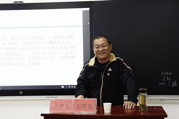 邓辉煌教授全面阐述了学习“四史”的重大现实意义,带领学生回顾湘鄂西革命根据地的历史故事。他指出湘鄂西革命根据地是土地革命战争时期范围最大的三块红色根据地之一,恩施土家族苗族自治州的8个县是湘鄂西革命根据地的重要组成部分。