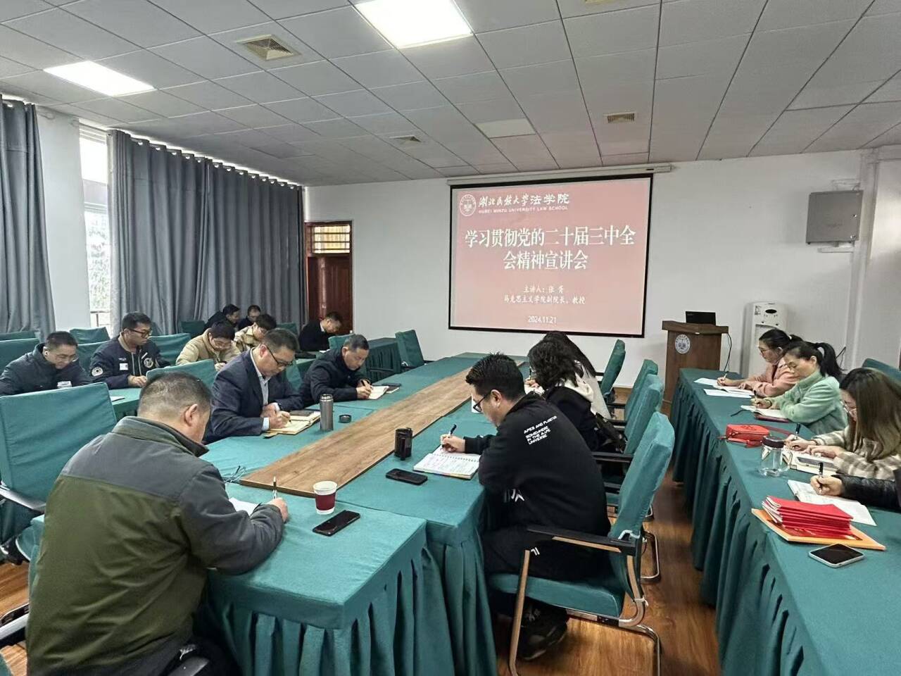 2024年11月21日,我院于德智楼9B314会议室举办了“学习贯彻党的二十届三中全会精神宣讲会”。365电子娱乐官方网站马克思主义学院副院长张胥教授主讲,法学院党总支书记张明波主持,我院30余名教职工参会。