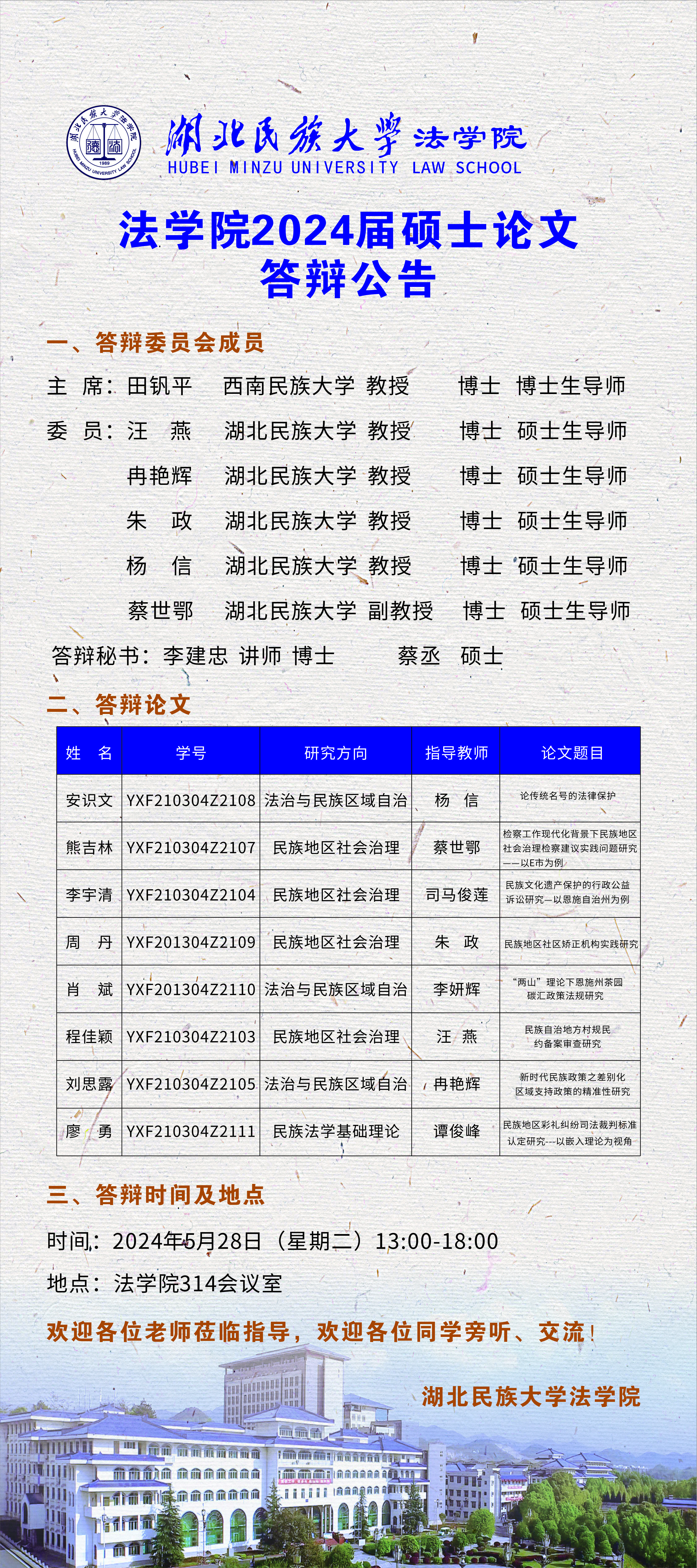 法学院2024届硕士论文答辩公告