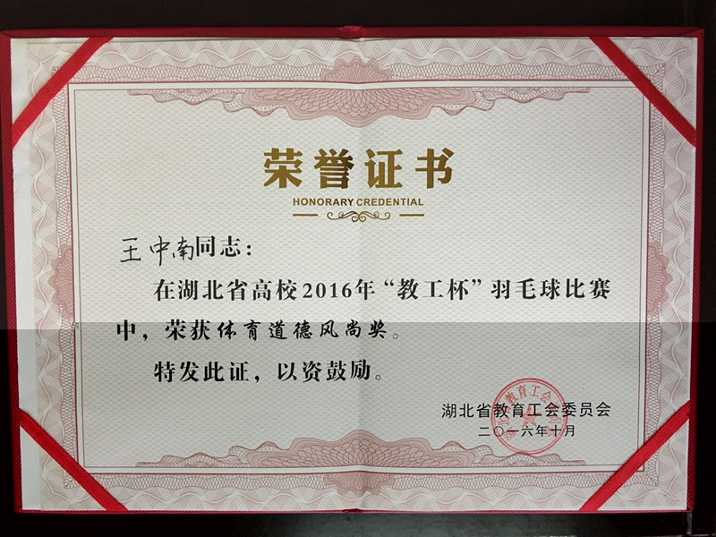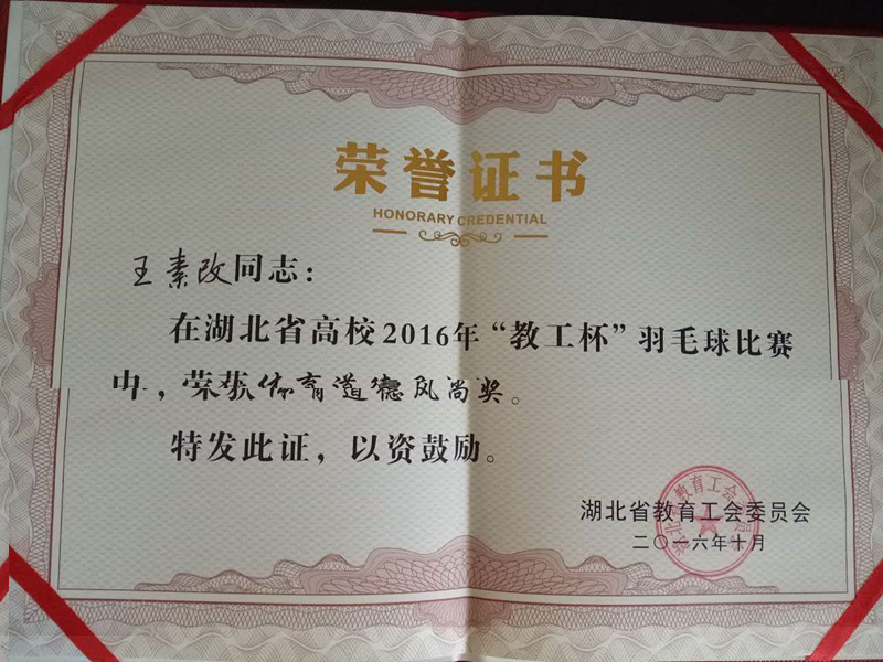 我校代表队在湖北省教育工会举办的全省高校“教工杯”羽毛球比赛中荣获第五名的好成绩,同时获得“优秀组织奖”,王中南、王素改老师获得“体育道德风尚奖”。