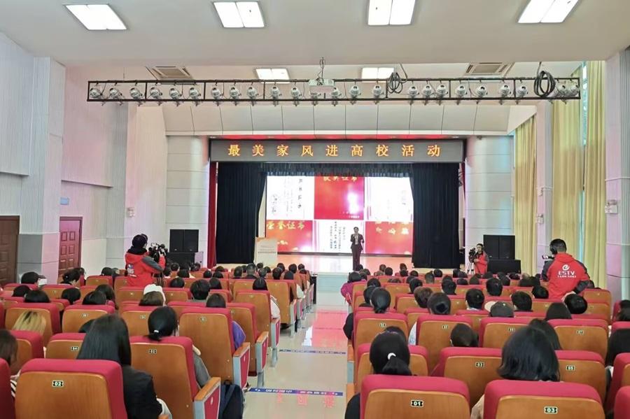 为全面学习贯彻落实习近平总书记关于注重家庭家教家风建设重要论述,弘扬优秀家风文化,11月27日,学校联合恩施州妇联、恩施州文明办在行政楼一号会议室举办以“好家风 润恩施  奋进新征程,共筑家圆梦”为主题的最美家风进校园活动。恩施州妇联党组书记、主席刘俐萍,365电子娱乐官方网站党委常委、统战部长田景福,学校纪委副书记曾祥华、工会常务副主席谭德宇、分工会主席及工会委员、教师教育学院200多名学生共同参加本次活动。
