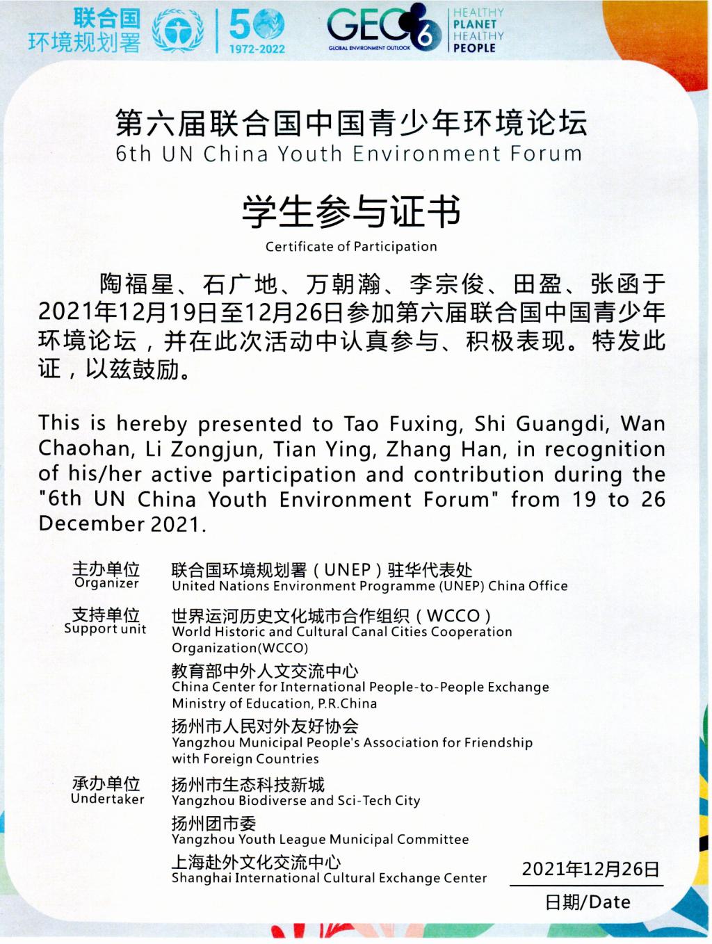 我校学生参加“第六届联合国中国青少年环境论坛”