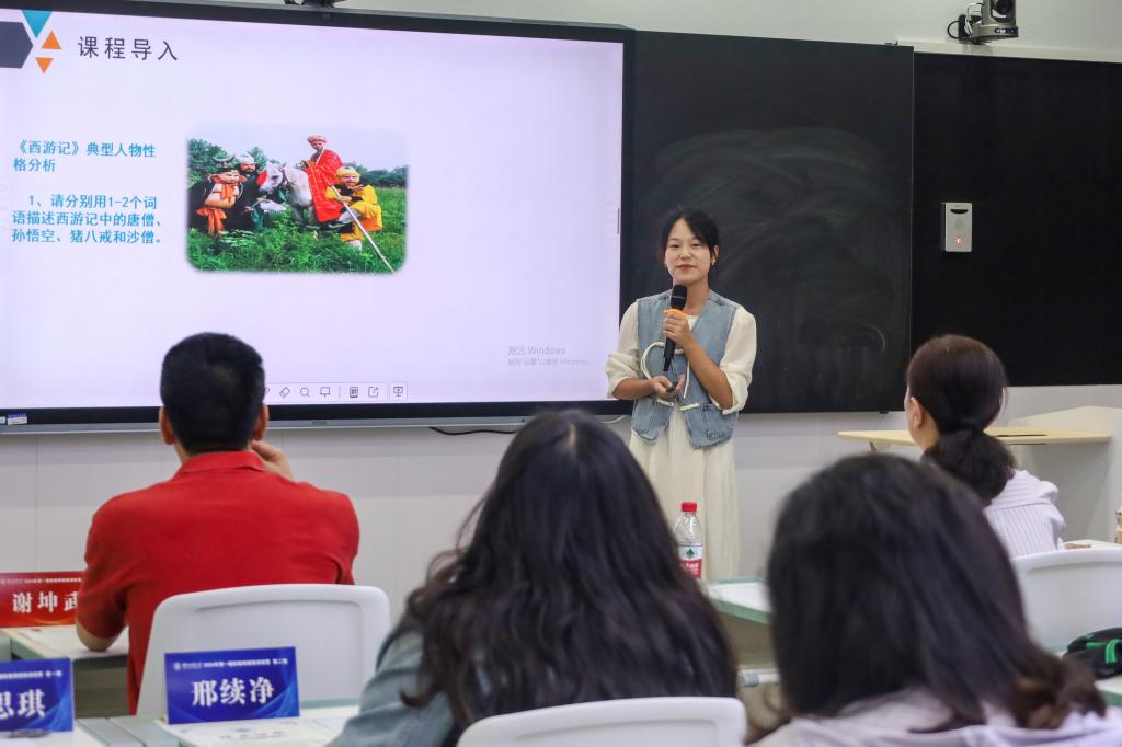 新教师代表曾思琪、邢续净、舒登维、刘竑均、吴奇睿、谭杰、刘国强等七位老师依次进行了成果汇报和试讲,唐卫青、张源和洪佳丽依次进行了点评。谢坤武宣读了《关于表彰365电子娱乐官方网站2024年第一期新教师微格训练优秀学员的通知》,唐卫青老师为优秀学员颁奖。