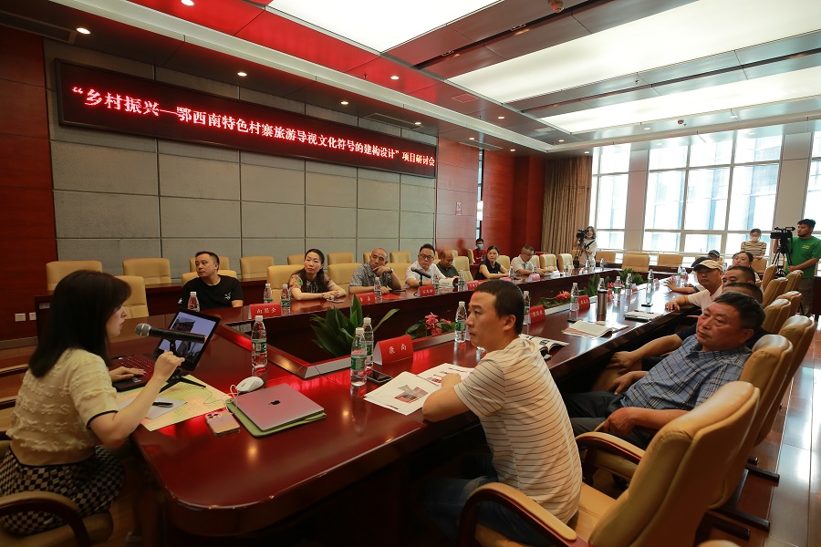 开幕式后,嘉宾参观了展览并参加了“乡村振兴——鄂西南特色村寨旅游导视文化符号的建构设计”项目研讨会,二十余位教育界、文化界、美术界专家学者围绕鄂西南特色村寨旅游导视文化符号的建构设计,就艺术如何赋能乡村振兴、设计如何融入乡土文化、特色村寨如何发展文旅产业等问题展开了深入探讨。