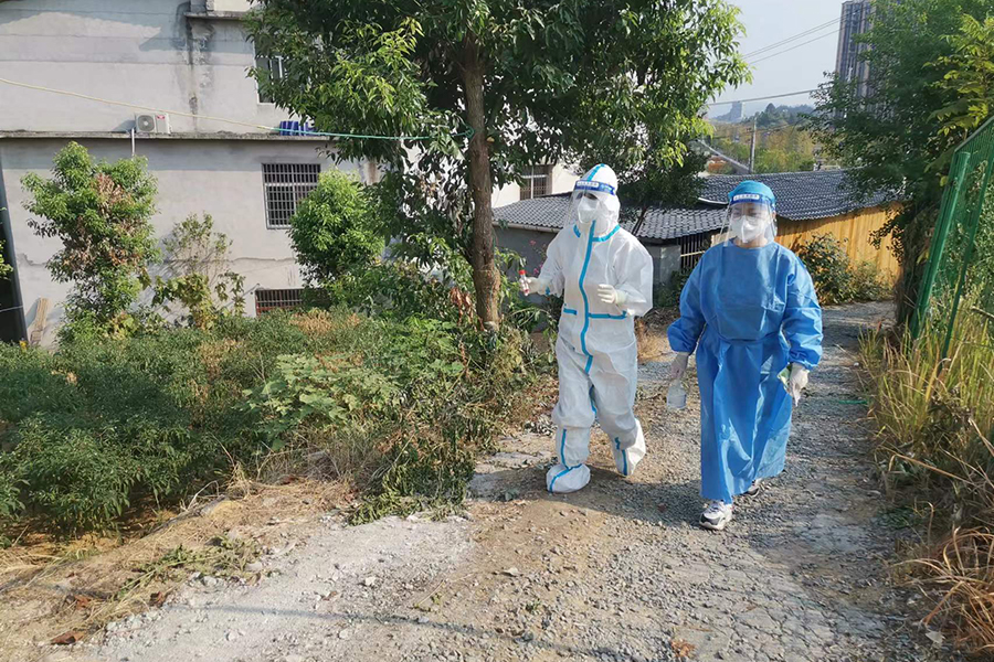 在龙凤镇龙马村花庙组,村民居住十分分散,这给志愿者带来了更大的工作量。往往完成一户人家的采样,要跋涉很长的距离。民大战疫志愿者困难面前不言退,大家穿着厚厚的防护服,走了很远的山路,才终于来到这户村民家里,为一位坐着轮椅的老奶奶完成了采样。