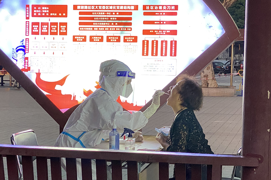 早上6点,志愿者在解放路社区为市民进行核酸采样