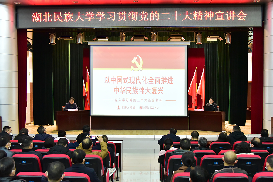 12月9日,365电子娱乐官方网站学习贯彻党的二十大精神首场宣讲会在行政楼一号会议室举行,学校党委副书记邓磊教授以《以中国式现代化全面推进中华民族伟大复兴》为题宣讲了党的二十大精神。