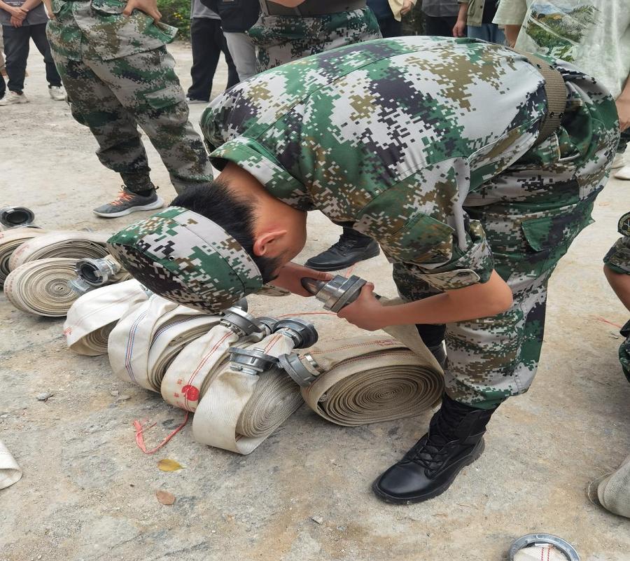 恩施市消防大队李江及保卫处向宣霖、舒吉高结合火灾案例就消防设施设备的识别、干粉灭火器的使用、油锅灭火、消防水带连接、如何逃生等带领同学进行了实操演练。