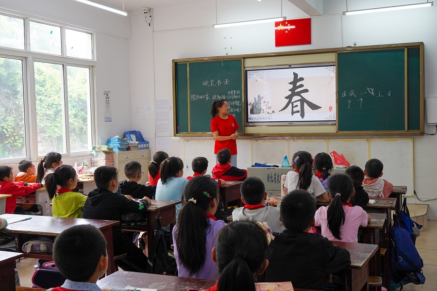 团队成员辅导小学生书写规范汉字
