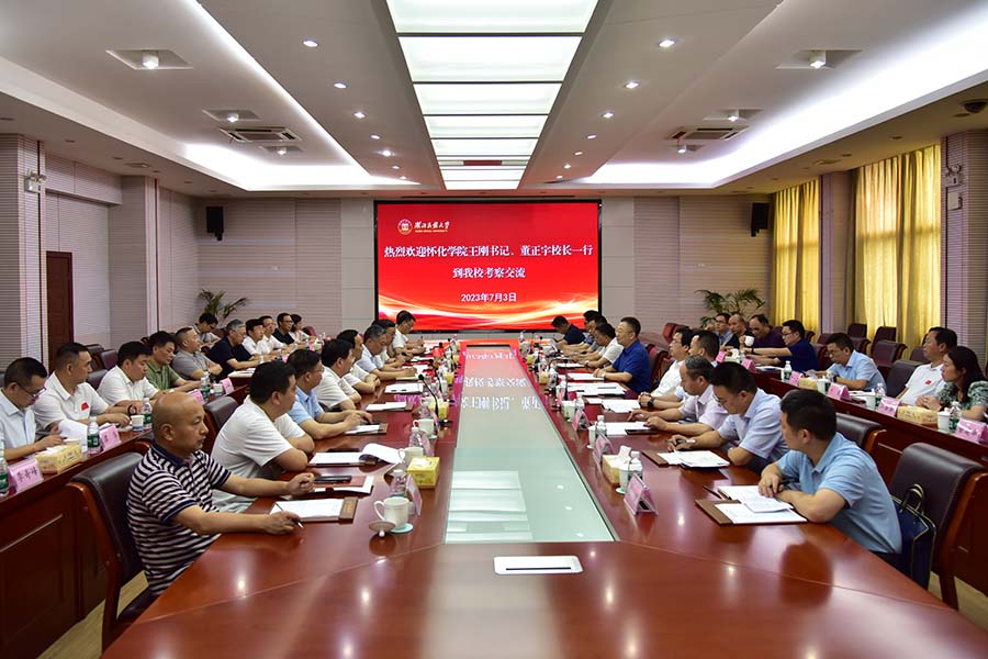 7月3日,怀化学院党委书记王刚,党委副书记、校长董正宇,党委委员、副校长伍贤进,副校长刘文华来校考察交流学校整体建设与发展,365电子娱乐官方网站党委书记向前进,党委副书记、校长顿祖义,党委副书记邓磊,党委常委、副校长刘志军接待了王刚一行。