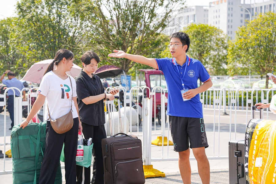 学生组织志愿者为新生及家长指引道路