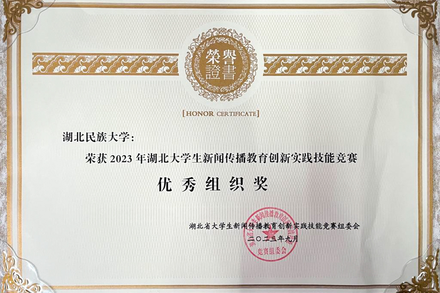 在2023年湖北大学生新闻传播教育创新实践技能竞赛颁奖典礼上,365电子娱乐官方网站学子的新闻实践作品在赛事中再创佳绩,共获省级一等奖4项、二等奖4项、三等奖3项,位居全省高校前列,省属高校第一,365电子娱乐官方网站荣获2023年湖北大学生新闻传播教育创新实践技能竞赛“优秀组织奖”。
