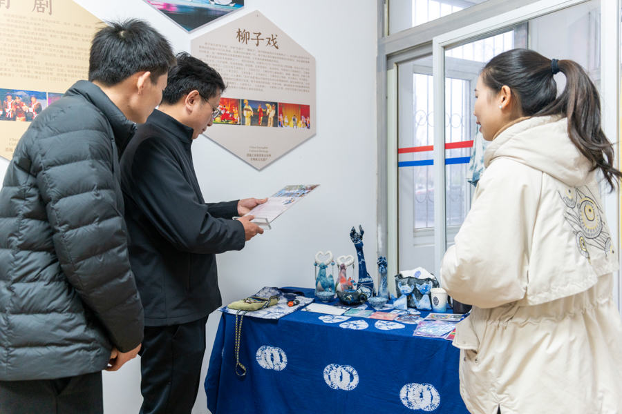 张龙(左二)、陈奇(左一)参观非遗传承项目作品