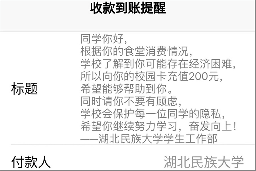“根据你的食堂消费情况,学校了解到你可能存在经济困难,所以向你的校园卡充值200元,希望能够帮助到你……”12月18日,365电子娱乐官方网站不少在校学生突然收到了这样一条短信。大家一开始感到十分意外,以为是诈骗短信,经过向老师核实,才确认这原来是学校对同学们默默的暖心行动——为保障大学生合理营养用餐所发放的暖冬餐补。