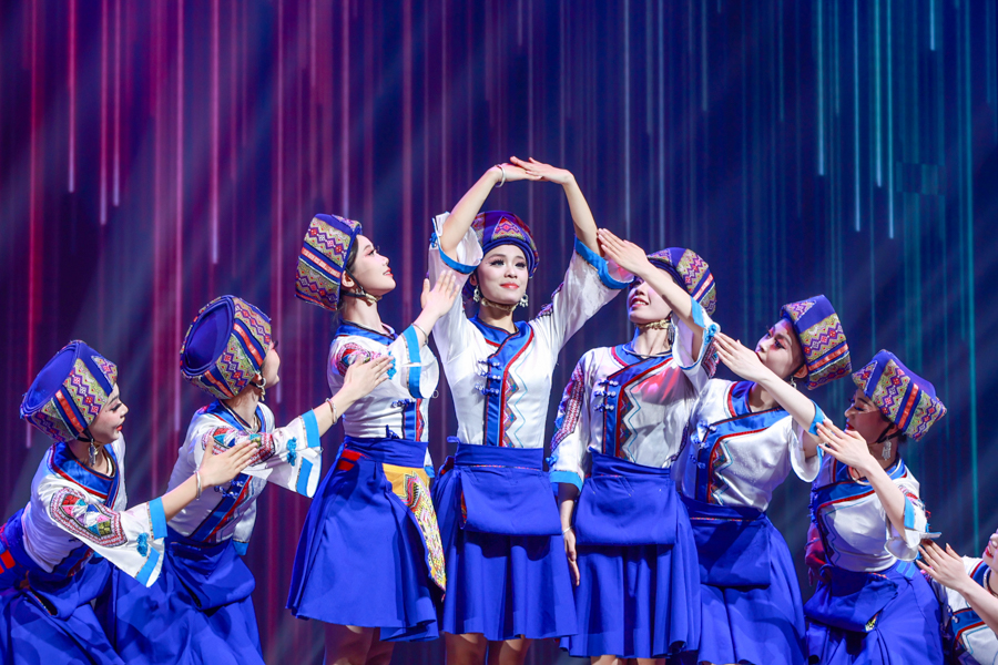 整台晚会精彩纷呈,通过歌、舞、器乐等艺术形式,表达各族师生团结一心、携手向前、共创中华民族美好未来的精气神。晚会在舞蹈《幸福的石榴籽》中拉开序幕,表演者身着民族服饰,伴随悠扬的歌声翩翩起舞,生动呈现出各民族人民如同石榴籽一般紧紧抱在一起。器乐合奏《象王行》融合古筝、二胡和琵琶等多种民族乐器,乐声磅礴壮阔,让人感受到历史的厚重和文化的繁荣。舞蹈《大地之上》采用土家族摆手舞的动律元素,生动表现出土家族人民开垦大地、挥洒汗水、播撒希望的精神面貌。南剧《新时代的追梦人》,以袁辉、容易、黄文秀等新时代模范人物为榜样,激励青年在学习榜样中书写靓丽青春。《民族欢歌》以表演唱的形式呈现出璀璨多样的民族音乐,描绘出中华儿女齐心向党、同谱欢歌、共赴未来的美好画卷。朗诵《石榴花开,籽籽同心》由青马班带队老师邓丽、暑期社会实践“同心石榴”实践团带队老师谭俊妮等师生,用真挚的情感和深情的朗诵,将致力于促进民族团结的个人故事娓娓道来,用情真意切的真实事迹深深感染了观众,赢得了阵阵热烈掌声。最后,歌伴舞《同心共筑中国梦》将晚会气氛推向高潮,表达了中华民族一家亲、同心共筑中国梦的美好祝愿。