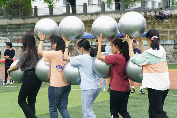 运动会设有“陆地龙舟”“瑜伽球竞速”“拔河”“袋鼠跳接力赛”“跳绳接龙”“两人三足踩气球”六个环节。在“陆地龙舟”环节中,由十位参赛者组成龙舟队进行比赛,各队成员相互合作,配合默契,共同带领“龙舟”向终点前进。在“袋鼠跳接力”环节中,参赛者套在袋子中跳跃接力,在一蹦一跳之间决出胜负。在“跳绳接龙”环节中,各队选手交替挥绳、跳跃,配合默契。在“两人三足踩气球”环节中,两名选手分别自行组队,团结协作,共同进退,全力以赴,努力争夺胜负。