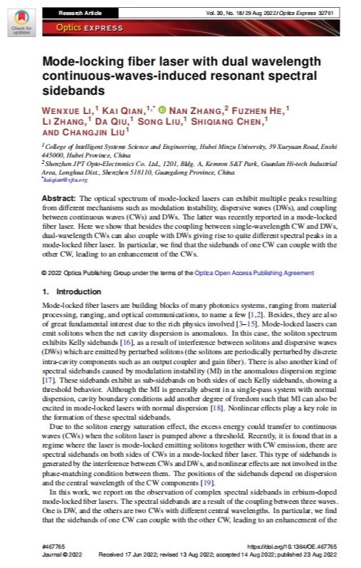 8月29日,智能学院光电信息科学与工程专业2018级本科生李文雪同学在国际光学领域权威期刊《Optics Express》第30卷第18期发表题为《Mode-locking fiber laser with dual wavelength continuous-waves-induced resonant spectral sidebands》的研究论文。