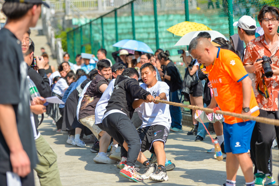 鼓声阵阵呐喊助威,4月10日上午,拔河比赛在五环田径场举行。扎好马步、勒绳下腰、降低重心,参赛队员双手紧握麻绳,全神贯注只待令声。力拔山兮,民大健儿团结齐心势不可挡。