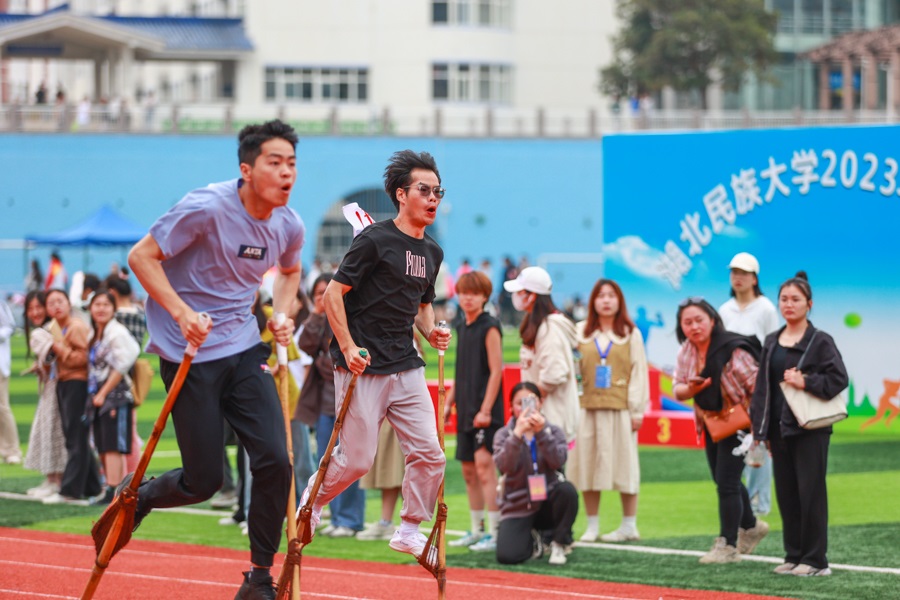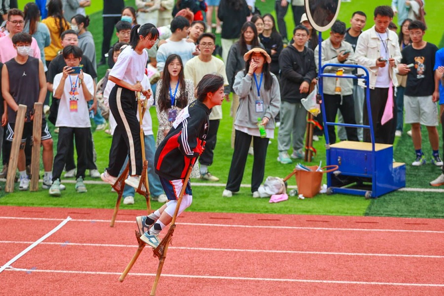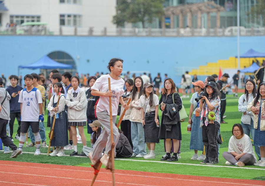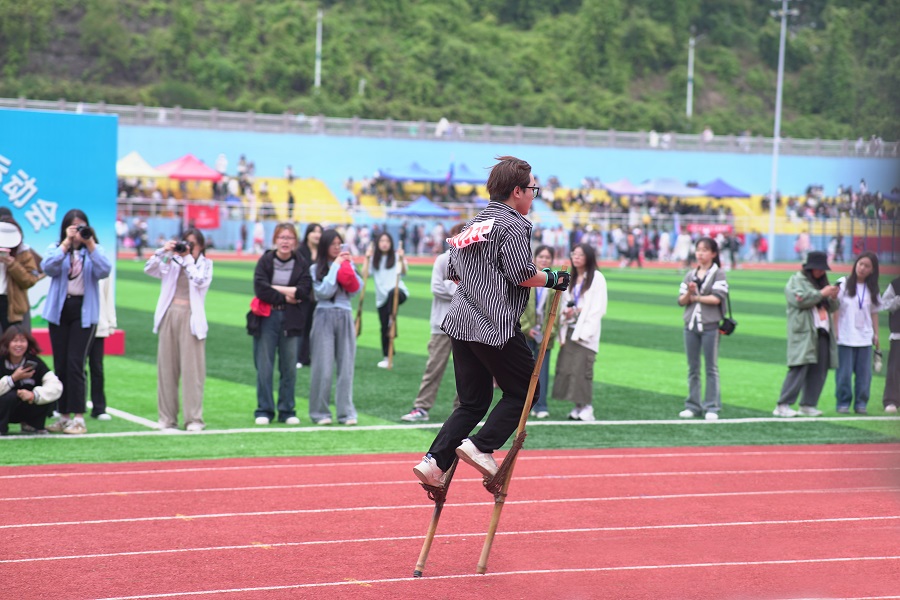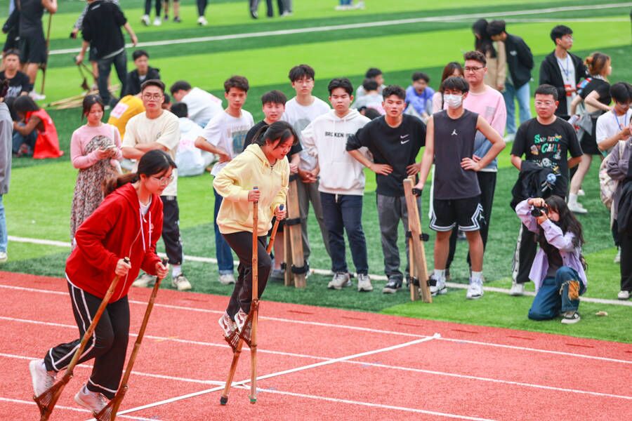 少年骋赛场,青春似骄阳。4月11日,高脚竞速比赛在五环田径场举行。运动健儿双手各持一杆,以竹化马,目光如炬,蓄势待发,一声枪响,以势如破竹之势飞速向前。