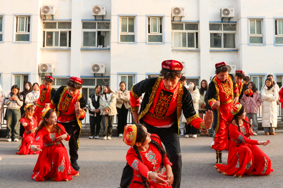 在心语社区,新疆籍学生穿着传统服饰登场,舞步豪迈,彰显独特的民俗风情。吾尔恩弹奏哈萨克族传统乐器冬不拉,节奏明快有力;藏族姑娘身着藏服佩戴哈达,演绎藏族舞蹈,呈现深厚的藏族文化底蕴;于米提用维语和汉语共同演唱歌曲,生动展现文化的交流融合。游戏互动环节,学生在答题过程中,科普少数民族节日、语言、习俗等相关知识,增加对各民族的了解、拓宽视野。