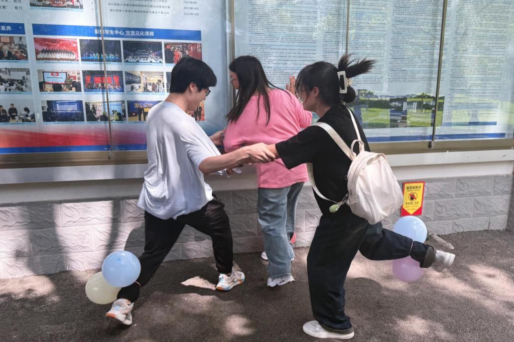 5月25日,心理健康工作室在大学生广场举办“走出心灵的雨季”游园会。知识问答区以趣味竞答的形式普及心理常识。“压力气球爆破赛”中,学生在保护自己气球的同时主动出击,用运动释放焦虑。“喜忧交换墙”上贴满匿名心事与暖心回复,陌生人间的善意悄然流动。两米高的治愈系玩偶“抱抱哇”张开双臂,收获上百个温暖拥抱。活动通过游戏化设计,将心理疏导转化为青春洋溢的社交体验。