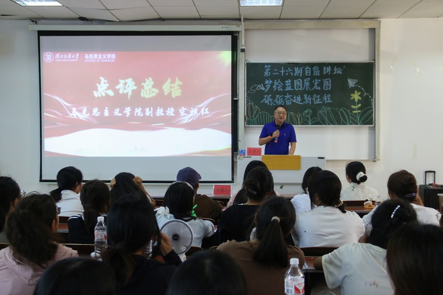 为进一步学习贯彻党的二十届三中全会精神,9月27日,马克思主义学院在德智楼9B210教室举办以“梦绘蓝图展宏图,砥砺奋进新征程”为主题的第二十六期自信讲坛活动。活动特邀马克思主义学院宋祖红副教授为嘉宾,马克思主义学院研究生杨稀和本科生赵光荣担任主讲人,马克思主义学院全体大一学生参与活动。