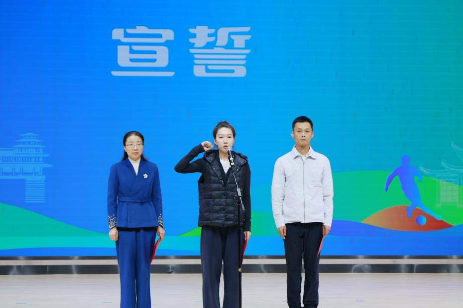 三峡大学志愿者王睿琪与武汉体育学院领队郜卫峰、恩施州体育局副局长徐忠碧宣誓,表达投身支教事业的热忱。