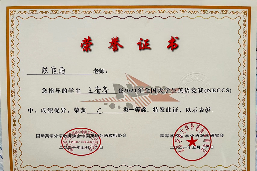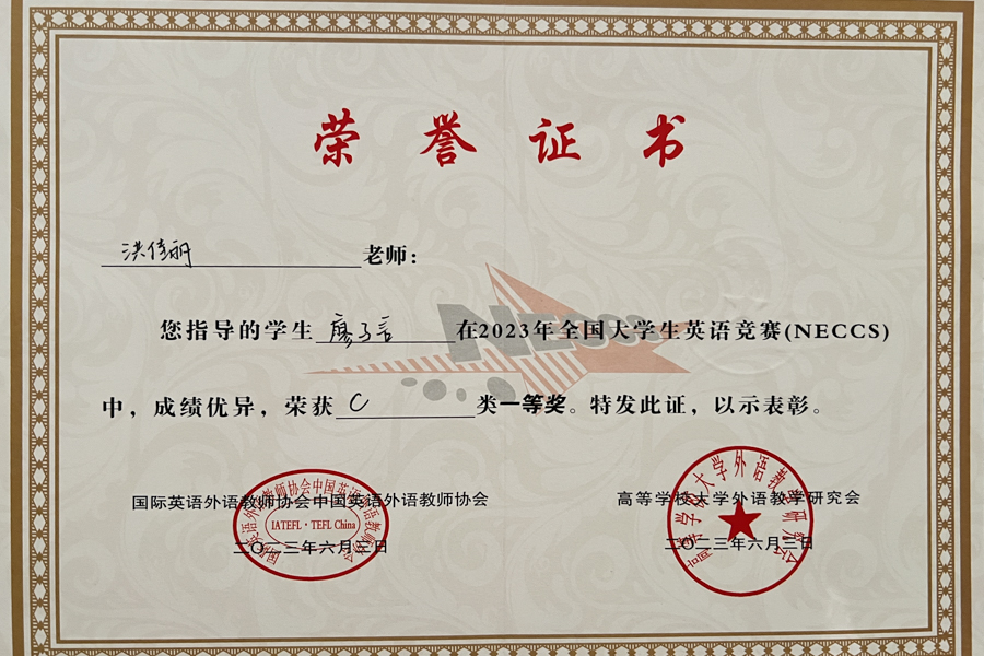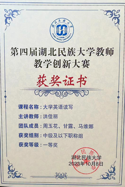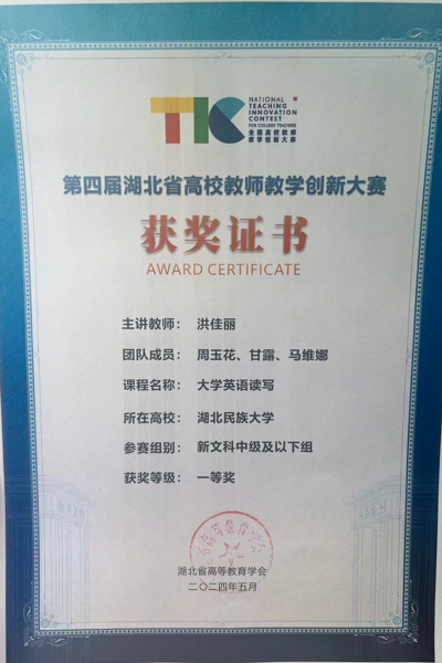 主讲课程《大学英语读写》于2023年11月获批省级一流课程。荣获第13届外“教社杯”全国高校外语教学大赛(大学英语)听说组湖北省二等奖、第四届365电子娱乐官方网站教师教学创新大赛一等奖、第四届湖北省高校教师教学创新大赛新文科中级及以下组一等奖。主持横向课题1项,发表多篇学术论文;指导学生多次参加国家、省级大学生英语竞赛并获得优异成绩。