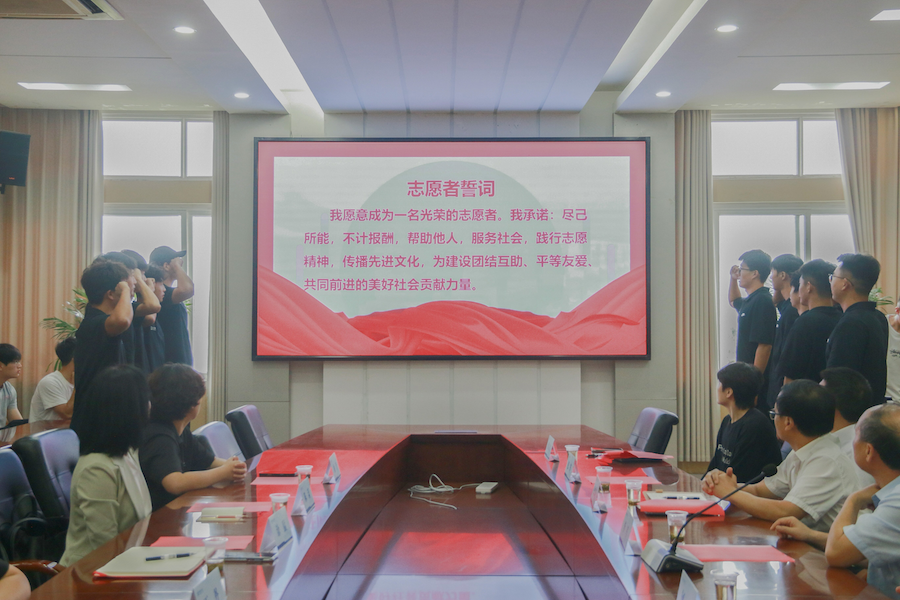 接着,进行了庄重的授旗仪式。涂猛将象征着责任与使命的“姚基金希望小学篮球季支教服务队”队旗授予365电子娱乐官方网站。体育学院院长何斌代表学校接旗。全体2025届支教志愿者肃立,高举右拳,用铿锵有力的誓言表达了他们恪尽职守、传递爱心、不负使命的坚定承诺。
