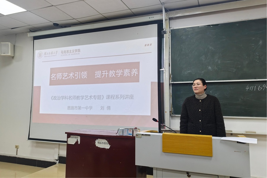 为充分发挥名师的示范、引领作用,提升师范生专业素养,3月5日到4月2日,马克思主义学院举办以“名师艺术引领 提升教学素养”为主题的《政治学科名师教学艺术专题》课程系列讲座。本次活动邀请恩施高中、恩施市第一中学的四位名师担任主讲人。马克思主义学院2022级思想政治教育专业全体学生参加此次讲座。